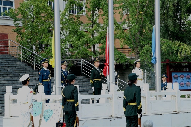 初晨破云,秋风瑟起,银杏繁叶,晓雀鸣啼,明湖秋水泛起阵阵涟漪,显得格外静谧。升旗仪式开始,全体师生默然肃立,国旗护卫队在口令的指示下,踏着坚定的步伐,整齐划一迈向升旗台。国歌旋律响起,悠扬且庄重,五星红旗在全体师生的注目礼中,缓缓升起,与晨空融为一体,更显夺目。
